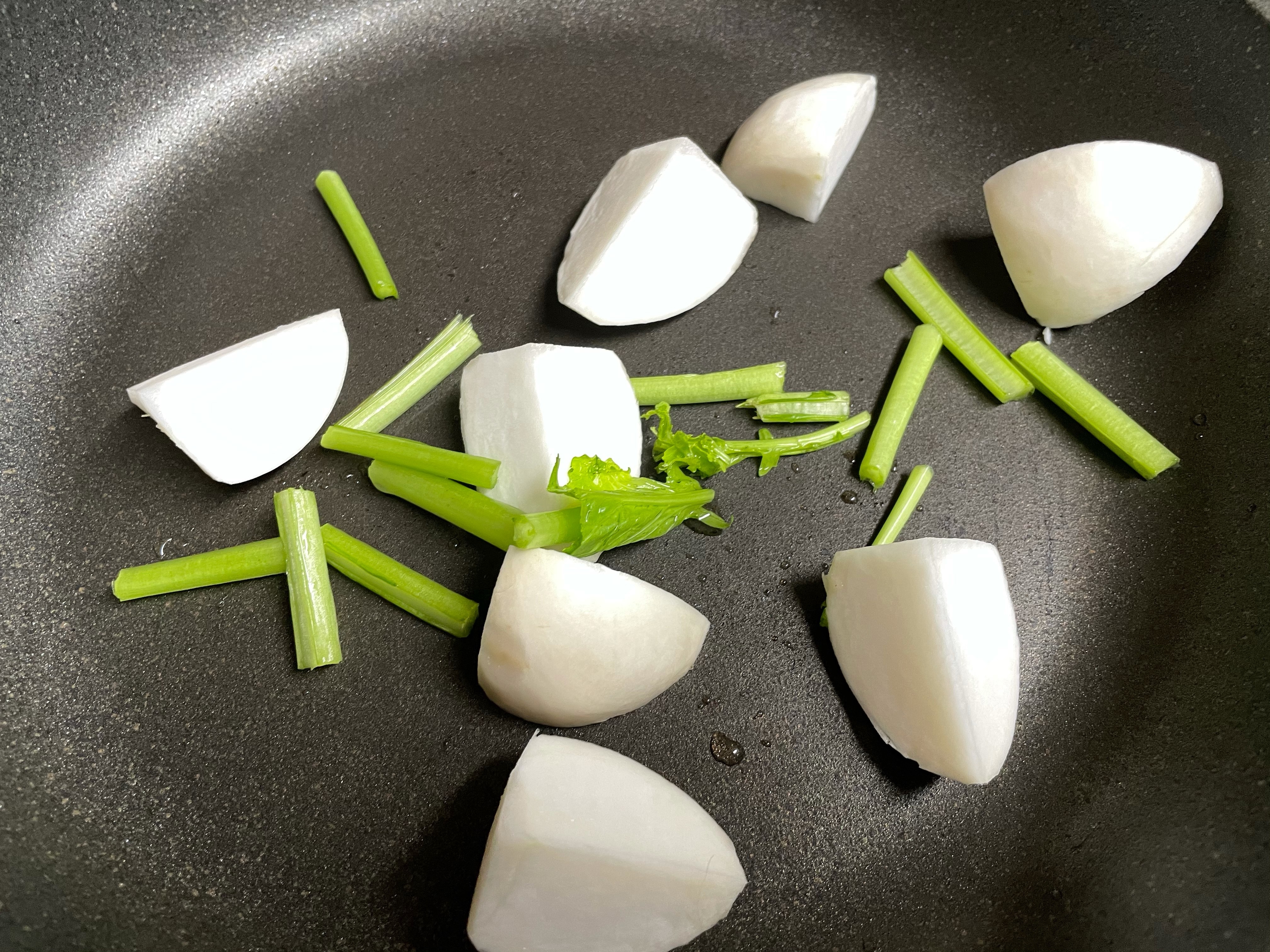 オリーブオイルをフライパンしき、カブと茎を炒め塩コショウをふり中火で炒める