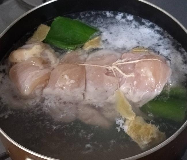 剥いでおいた鶏皮は小さく切ってカリカリに焼き、茹でた鶏にトッピングする。