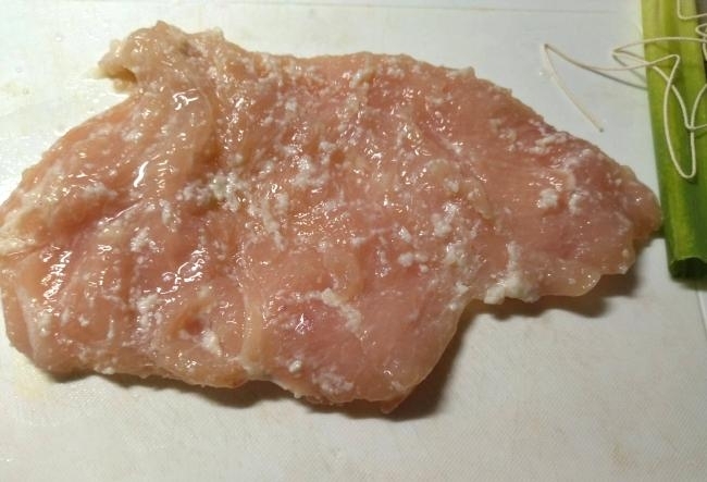 鶏むね肉の皮を剥いで厚みが均一になるよう開き◇の調味料をまぶして30分くらい置く。
