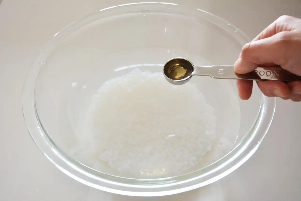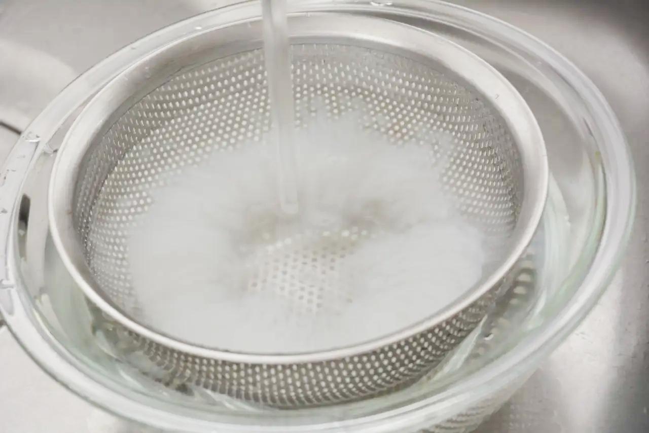 生こんにゃく米をボウルに入れ、水500mlと酢小さじ1を入れて2~3分浸ける。