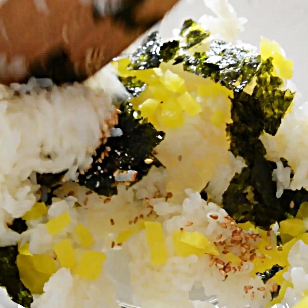 炊きあがったら、粗みじん切りにしたたくあん、韓国のり、白ごま、塩を混ぜる。