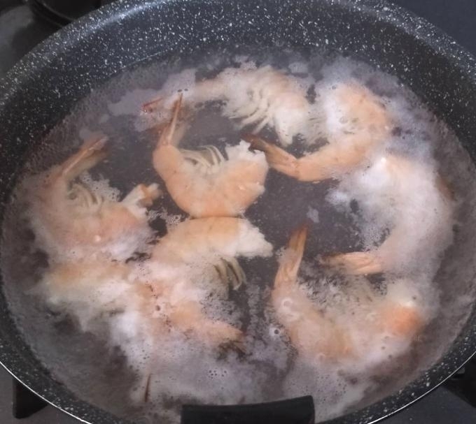 ★の調味料を入れたお湯が沸いたら海老を入れ、色が変わったらザルにあげて水気を切り殻を剥いておく。