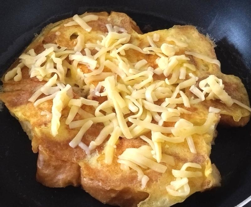 焦げ目が付いたらひっくり返し、一面にシュレッドチーズを散らして蒸し焼きにする。