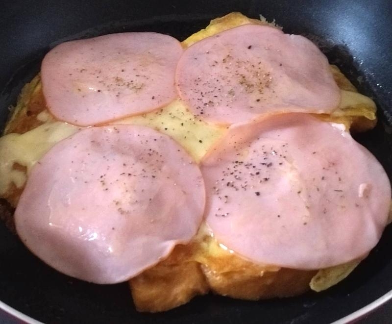 ハムとチーズを乗せて粒胡椒でピリっと味を引き締めました。