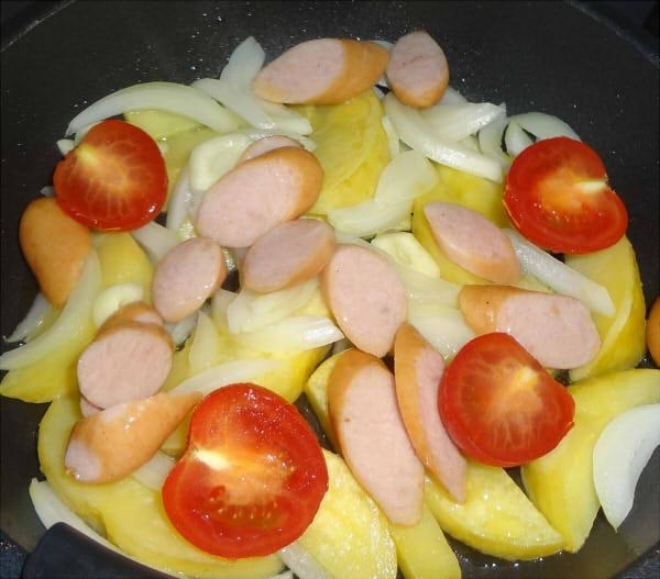 さらに輪切りにしたソーセージを入れて焼き色が付いたら☆の調味料を加えてひと混ぜして半分にカットしたプチトマトを乗せる。
