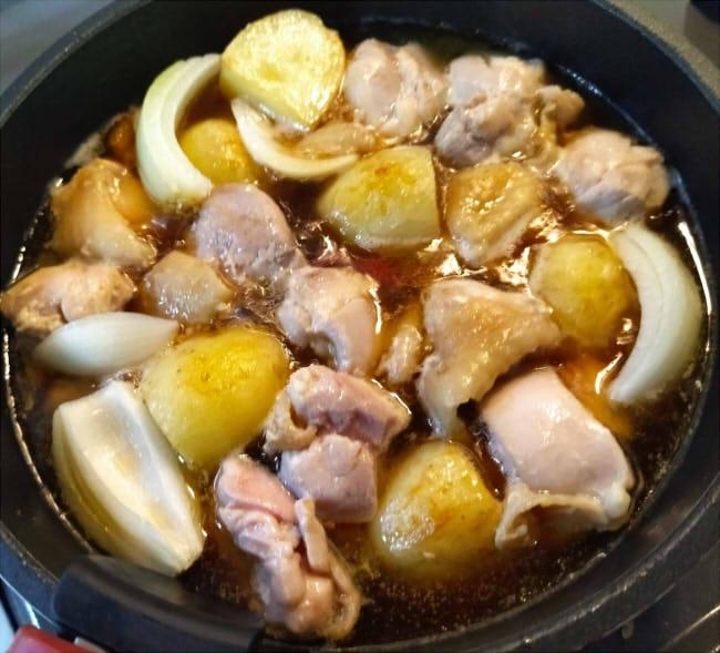 鶏肉に7割りくらい火が入ったら玉ねぎと☆の調味料を加えて弱火で煮込む。