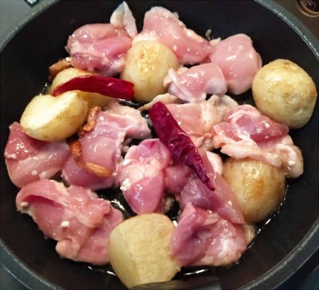 新じゃがに串が刺さるようになったら鶏肉と唐辛子を加えて一緒に蒸し焼きにする。