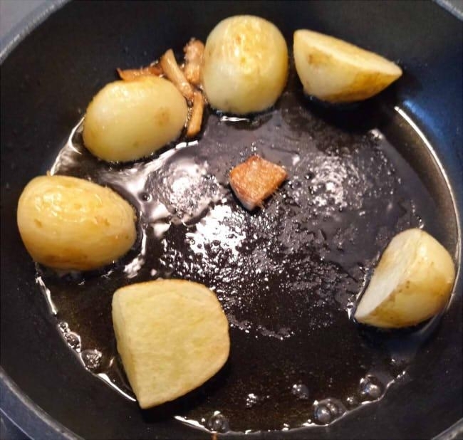 フライパンに油を少し多めに入れてじゃがいもと生姜を並べ弱火で蒸し焼きにする。