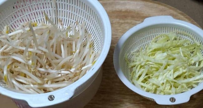 もやしは洗ってザルにあげておき、キャベツは千切りにしておく。