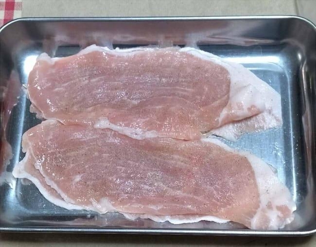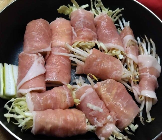 豚肉を広げて塩コショウと片栗粉を振って1のみじん切りした長ネギ以外の野菜を適当な量乗せてくるくる巻いておく。