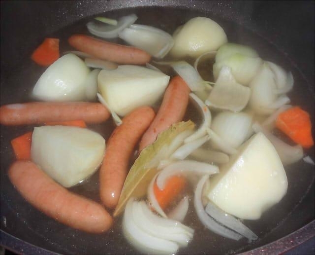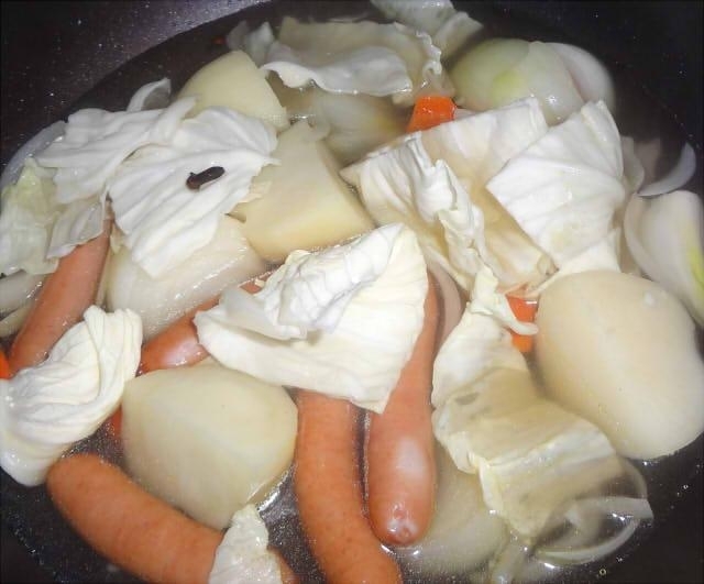 ソーセージから旨味が出過ぎないように切り込みは入れませんでした。炒めた後一旦取り出して最後に加えると旨味がソーセージに残りますがスープに出汁は出なくなります。どちらが良いかお好みで。