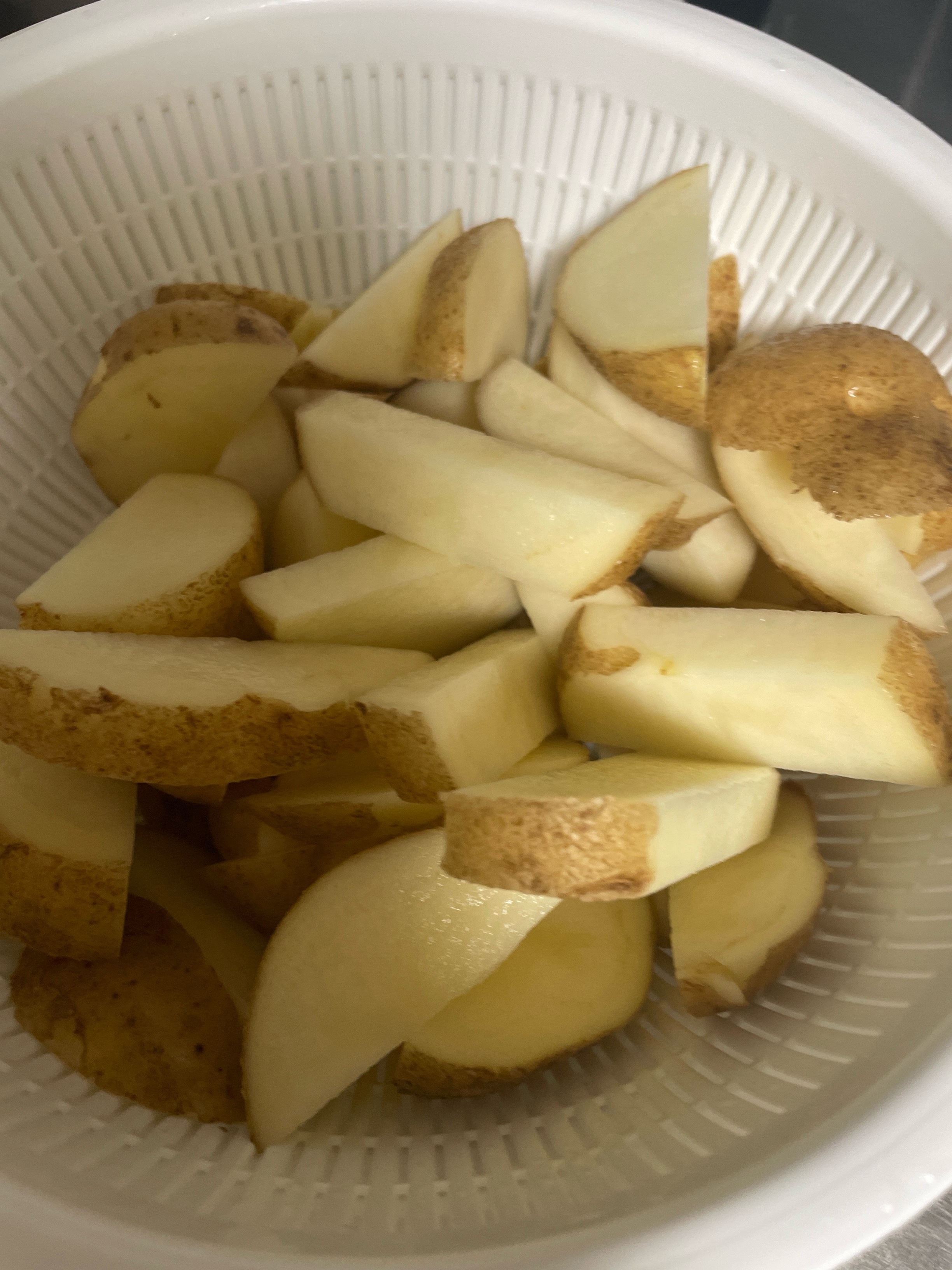 フライパンに米油を入れて②のじゃがいもを揚げていきます。