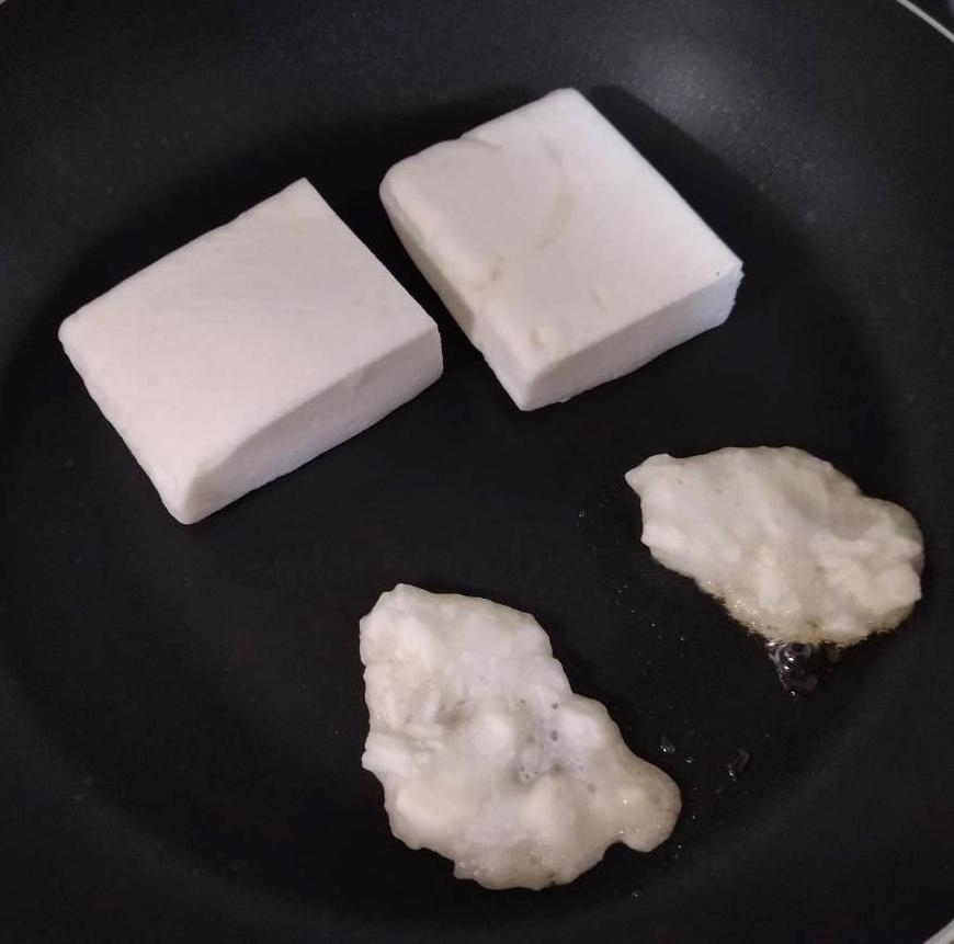 フライパンに薄く油を塗ってはんぺんと2の長芋を小さくまとめて弱火で焼く。