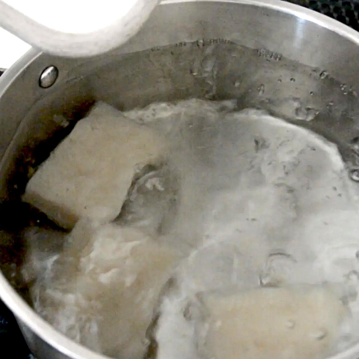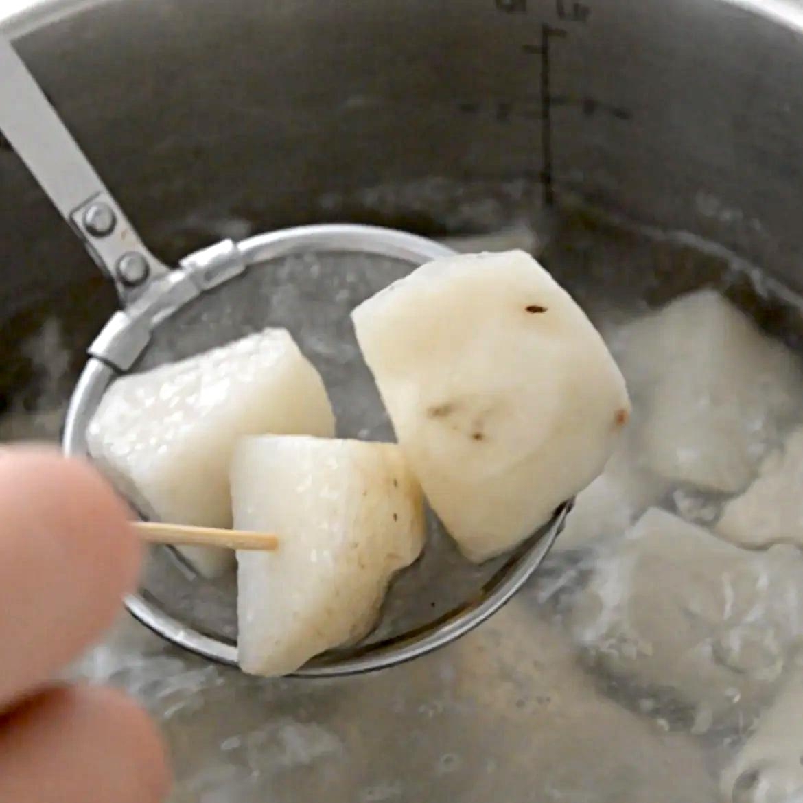 たっぷりのお湯を沸かし、こんにゃくを入れる。再沸騰後30分茹で、冷水にとる。