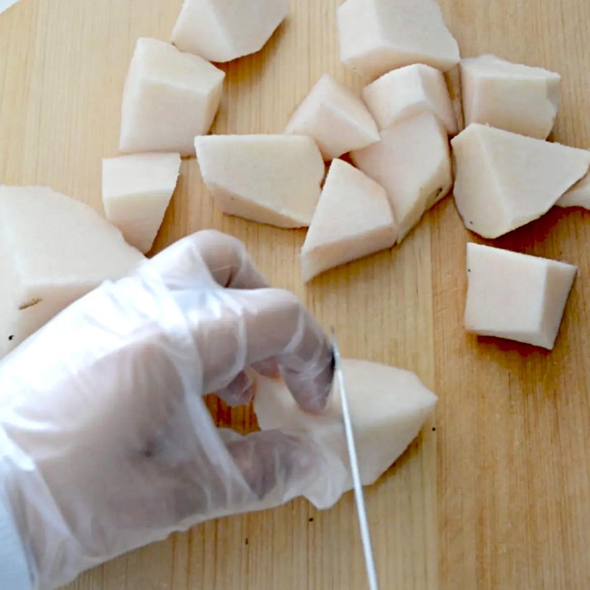 手袋をして皮をむき、芽を取り除いて一口大の乱切りにする。