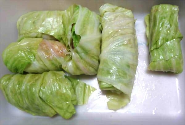 敗れた部分には余ったキャベツなどを貼り付けて巻終わりを下にして落ち着かせる。
