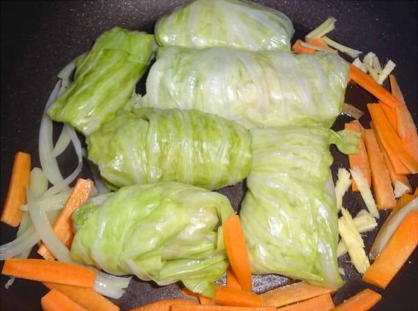深さのあるフライパンに油をひいて薄切りにした玉ねぎ(具材用)と人参を炒めて中央を空け、3のロールキャベツを置いて3分くらい焼く。