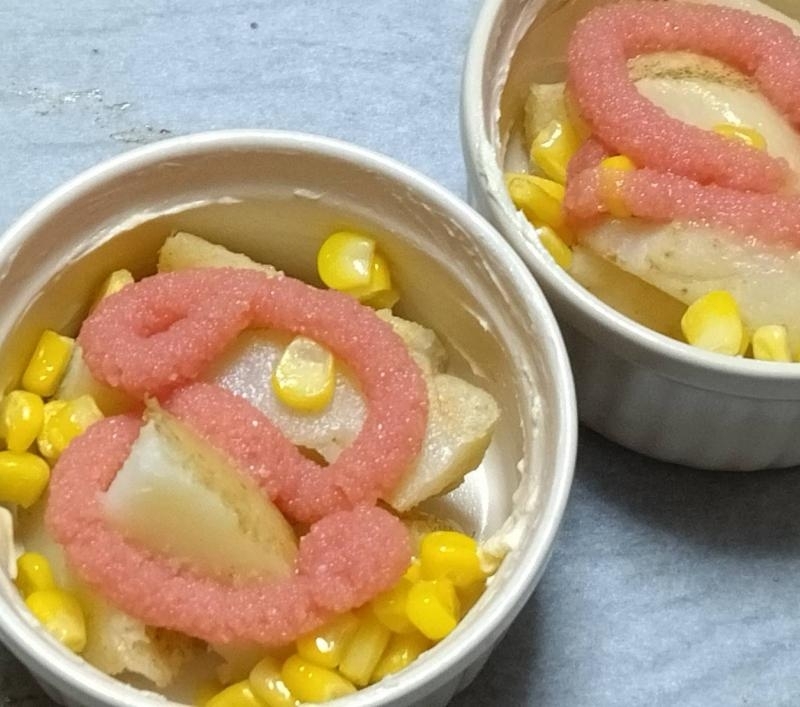 - 2 ココット型にバターを塗って一口大にカットした冷凍じゃがいもを入れて自然解凍させて粒コーンを散らす。