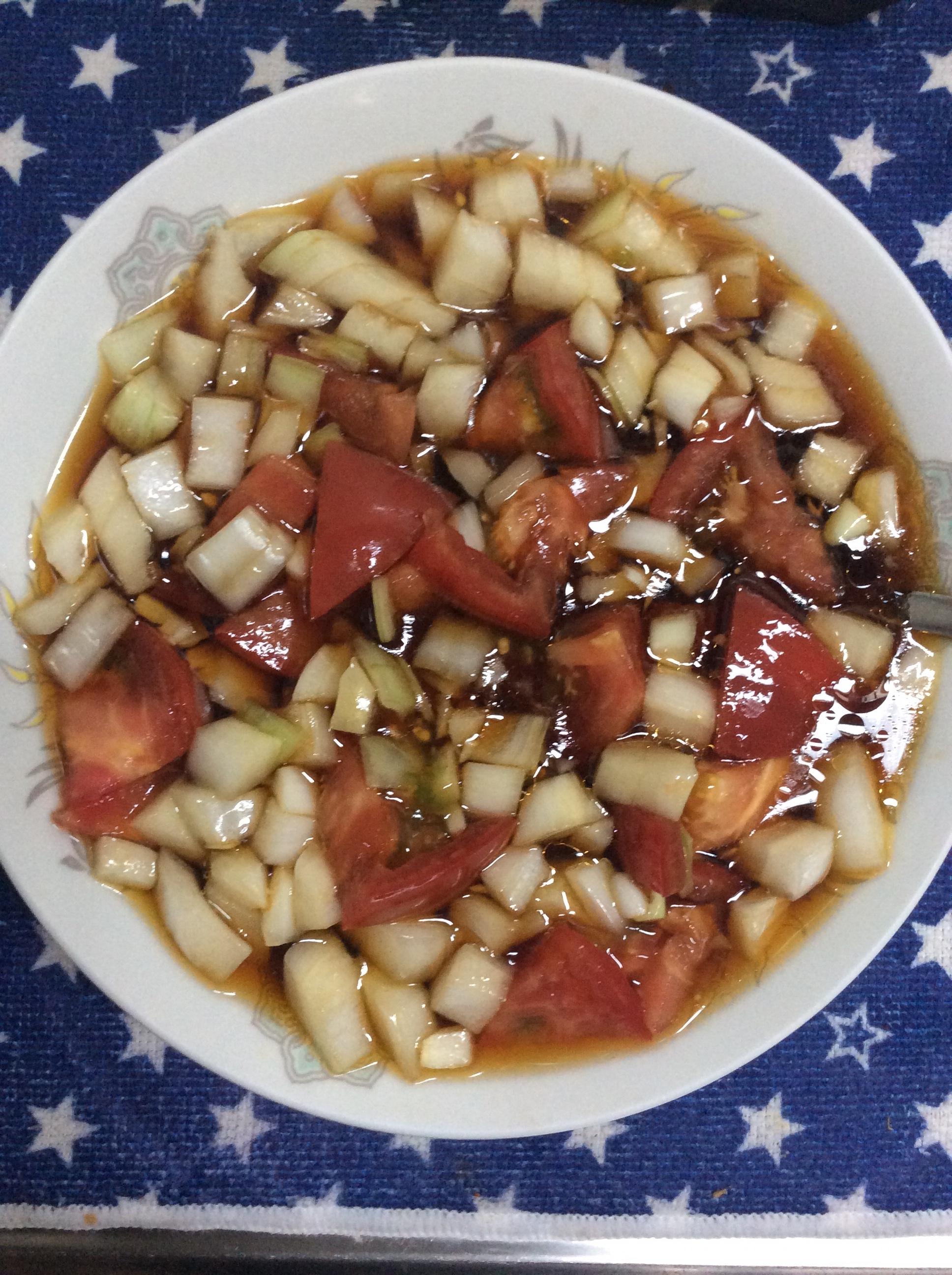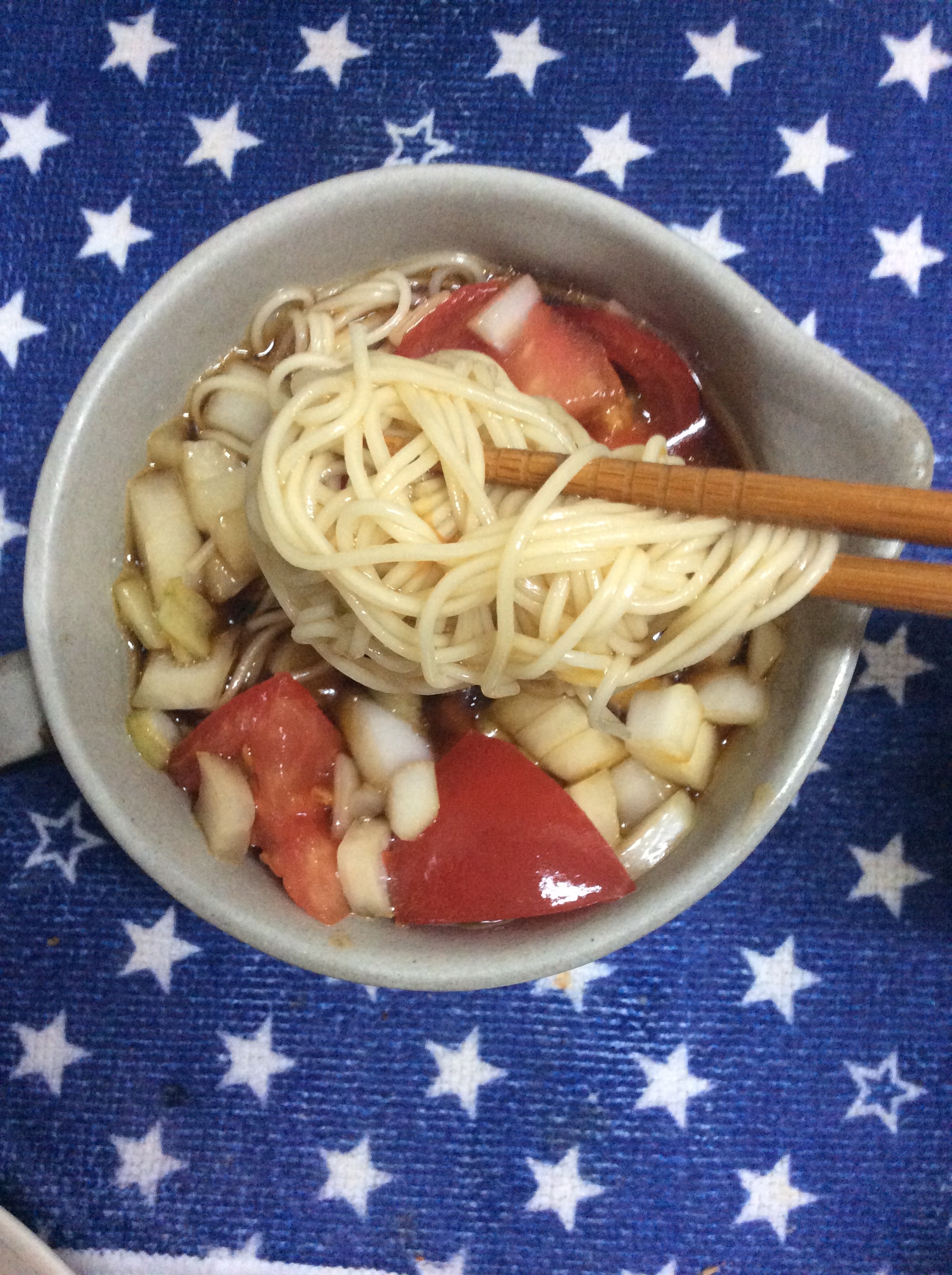 トマトの汁気で薄まるのと、具沢山なのでつゆは通常の希釈より濃いめになっています。 玉ねぎの辛みが気になる方は、新玉ねぎを使うと良いと思います。