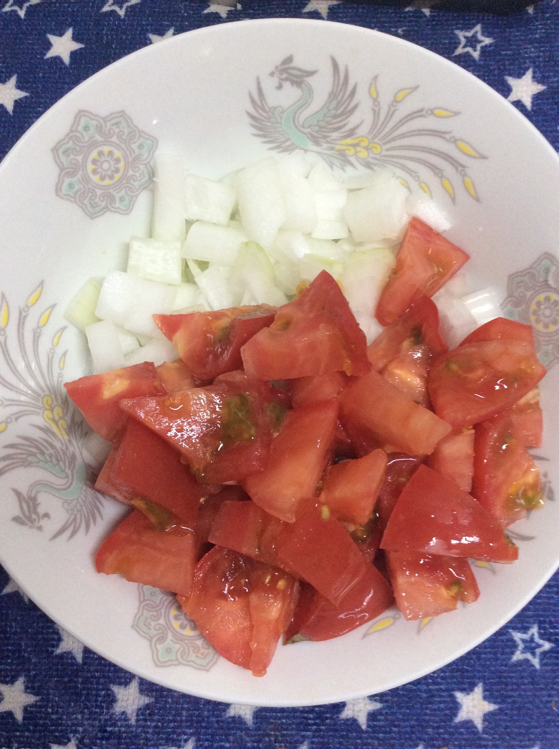玉ねぎは粗めのみじん切り、トマトはざく切りにします。